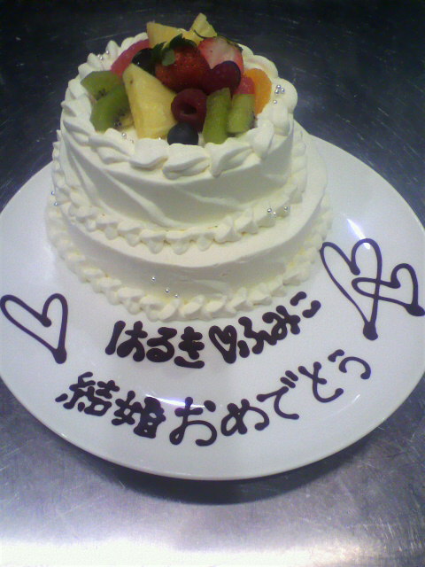 今日のバースデーケーキは、諸事情によりパティシエールさんが書いたメッセージにオレが作ったケーキをのっけるという合わせ技